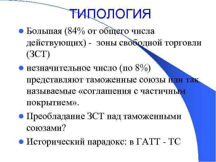 ТИПОЛОГИЯ l Большая (84% от общего числа действующих) - зоны свободной торговли (ЗСТ) l незначительное число (по 8%) представляют таможенные союзы или так называемые «соглашения с частичным покрытием» . l Преобладание ЗСТ над таможенными союзами? l Исторический парадокс: в ГАТТ - ТС
