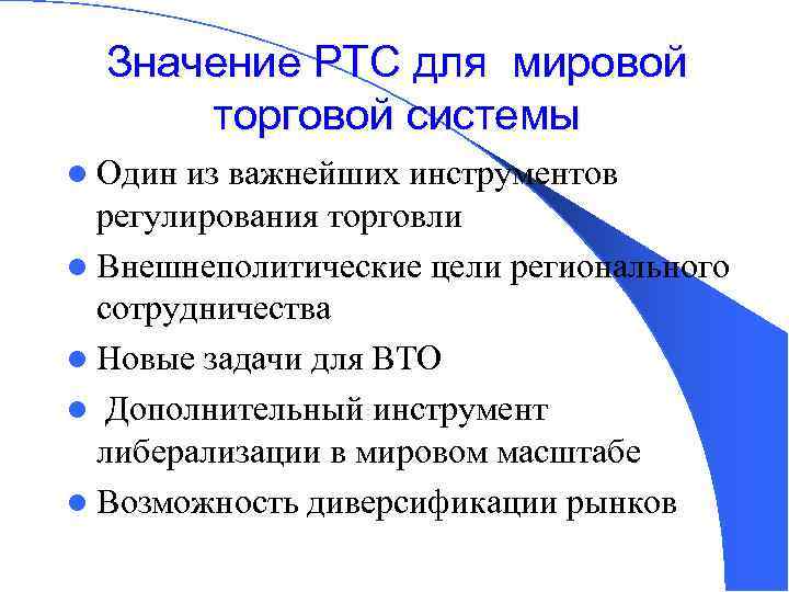 Значение РТС для мировой торговой системы l Один из важнейших инструментов регулирования торговли l Внешнеполитические цели регионального сотрудничества l Новые задачи для ВТО l Дополнительный инструмент либерализации в мировом масштабе l Возможность диверсификации рынков