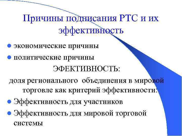Причины подписания РТС и их эффективность l экономические причины l политические причины ЭФЕКТИВНОСТЬ: доля регионального объединения в мировой торговле как критерий эффективности: l Эффективность для участников l Эффективность для мировой торговой системы