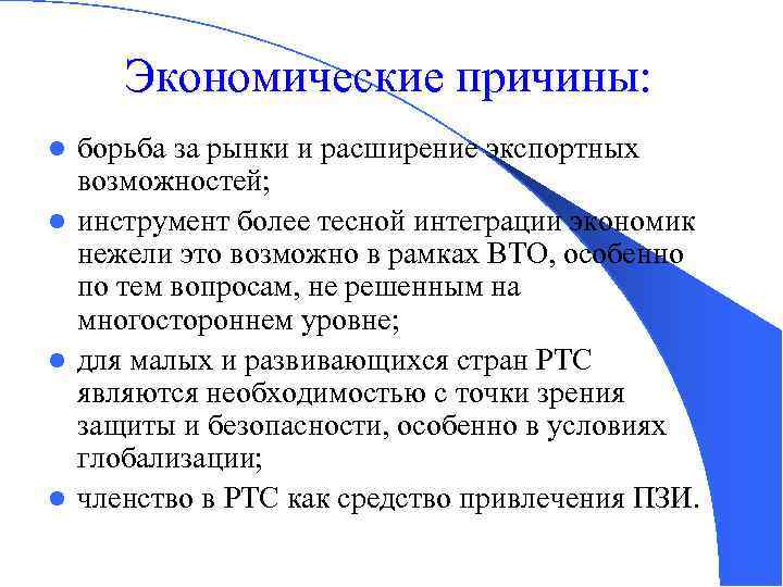 Экономические причины: борьба за рынки и расширение экспортных возможностей; l инструмент более тесной интеграции экономик нежели это возможно в рамках ВТО, особенно по тем вопросам, не решенным на многостороннем уровне; l для малых и развивающихся стран РТС являются необходимостью с точки зрения защиты и безопасности, особенно в условиях глобализации; l членство в РТС как средство привлечения ПЗИ. l