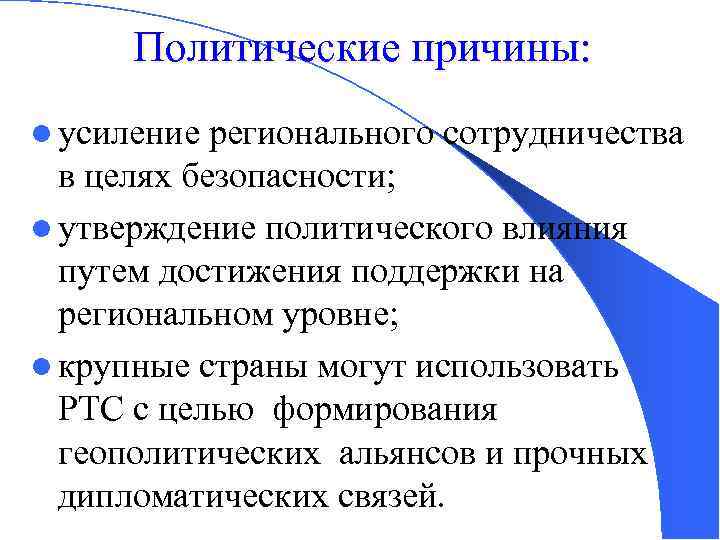 Политические причины: l усиление регионального сотрудничества в целях безопасности; l утверждение политического влияния путем достижения поддержки на региональном уровне; l крупные страны могут использовать РТС с целью формирования геополитических альянсов и прочных дипломатических связей.