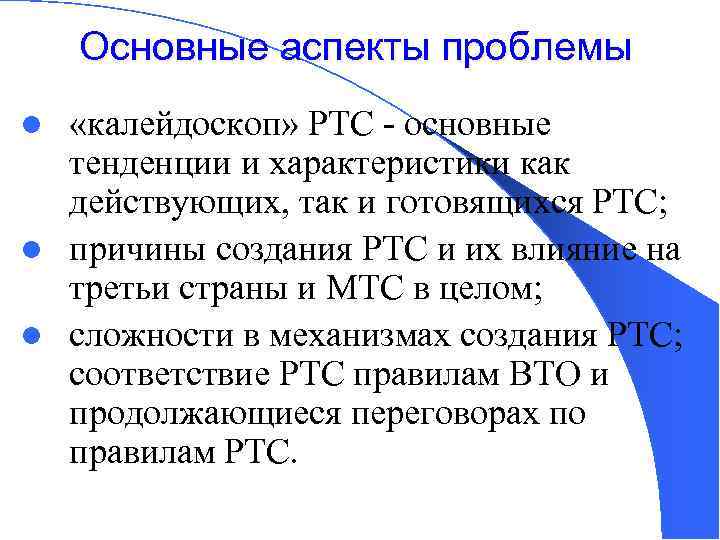Основные аспекты проблемы «калейдоскоп» РТС - основные тенденции и характеристики как действующих, так и готовящихся РТС; l причины создания РТС и их влияние на третьи страны и МТС в целом; l сложности в механизмах создания РТС; соответствие РТС правилам ВТО и продолжающиеся переговорах по правилам РТС. l