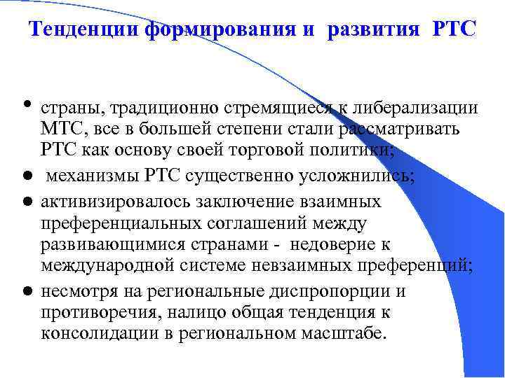 Тенденции формирования и развития РТС • страны, традиционно стремящиеся к либерализации МТС, все в большей степени стали рассматривать РТС как основу своей торговой политики; l механизмы РТС существенно усложнились; l активизировалось заключение взаимных преференциальных соглашений между развивающимися странами - недоверие к международной системе невзаимных преференций; l несмотря на региональные диспропорции и противоречия, налицо общая тенденция к консолидации в региональном масштабе.