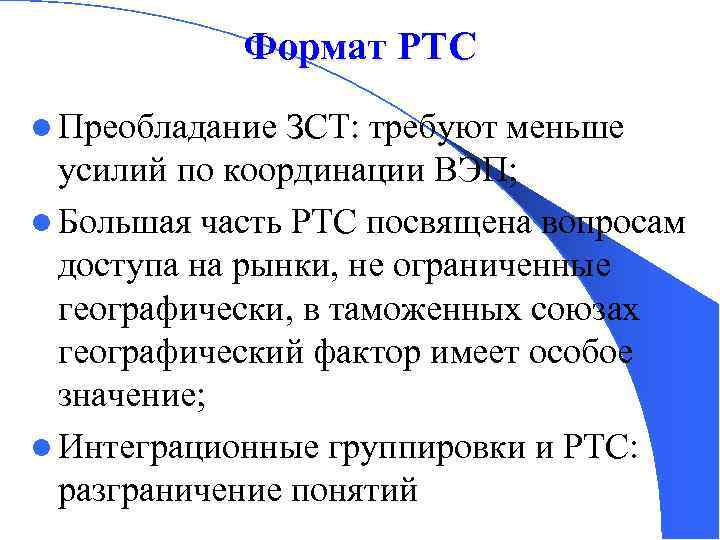 Формат РТС l Преобладание ЗСТ: требуют меньше усилий по координации ВЭП; l Большая часть РТС посвящена вопросам доступа на рынки, не ограниченные географически, в таможенных союзах географический фактор имеет особое значение; l Интеграционные группировки и РТС: разграничение понятий