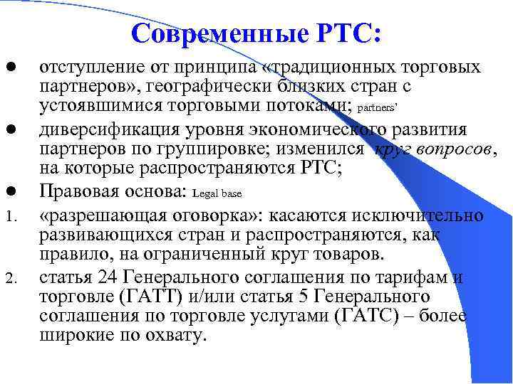 Современные РТС: l l l 1. 2. отступление от принципа «традиционных торговых партнеров» , географически близких стран с устоявшимися торговыми потоками; partners’ диверсификация уровня экономического развития партнеров по группировке; изменился круг вопросов, на которые распространяются РТС; Правовая основа: Legal base «разрешающая оговорка» : касаются исключительно развивающихся стран и распространяются, как правило, на ограниченный круг товаров. статья 24 Генерального соглашения по тарифам и торговле (ГАТТ) и/или статья 5 Генерального соглашения по торговле услугами (ГАТС) – более широкие по охвату.