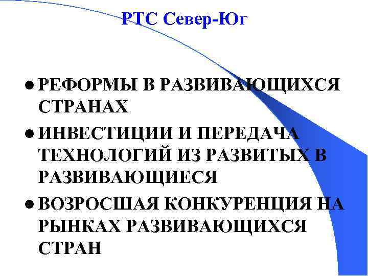 РТС Север-Юг l РЕФОРМЫ В РАЗВИВАЮЩИХСЯ СТРАНАХ l ИНВЕСТИЦИИ И ПЕРЕДАЧА ТЕХНОЛОГИЙ ИЗ РАЗВИТЫХ В РАЗВИВАЮЩИЕСЯ l ВОЗРОСШАЯ КОНКУРЕНЦИЯ НА РЫНКАХ РАЗВИВАЮЩИХСЯ СТРАН