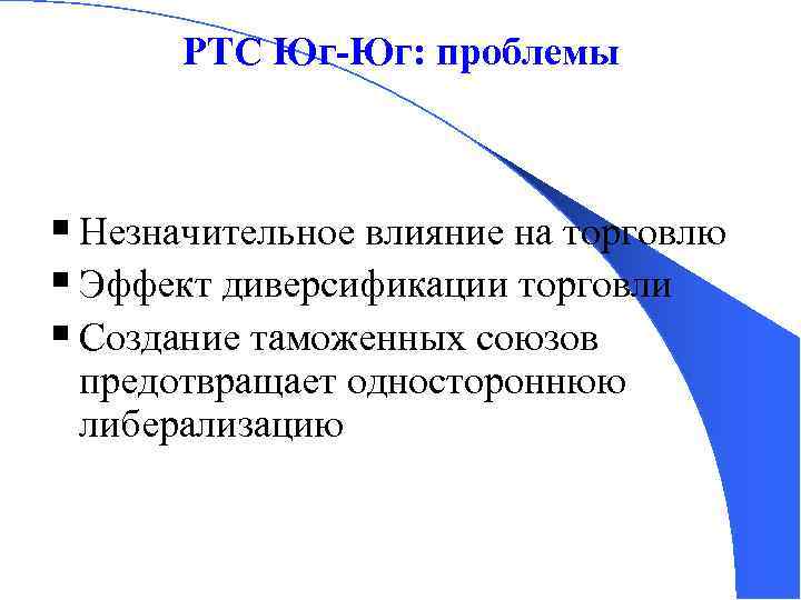 РТС Юг-Юг: проблемы § Незначительное влияние на торговлю § Эффект диверсификации торговли § Создание таможенных союзов предотвращает одностороннюю либерализацию