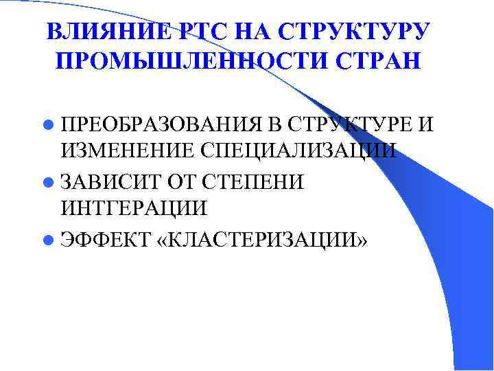 ВЛИЯНИЕ РТС НА СТРУКТУРУ ПРОМЫШЛЕННОСТИ СТРАН l ПРЕОБРАЗОВАНИЯ В СТРУКТУРЕ И ИЗМЕНЕНИЕ СПЕЦИАЛИЗАЦИИ l ЗАВИСИТ ОТ СТЕПЕНИ ИНТГЕРАЦИИ l ЭФФЕКТ «КЛАСТЕРИЗАЦИИ»