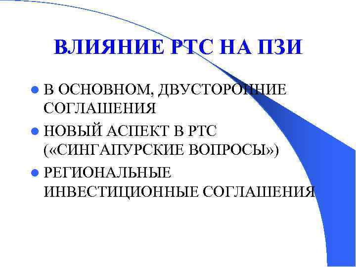ВЛИЯНИЕ РТС НА ПЗИ l В ОСНОВНОМ, ДВУСТОРОННИЕ СОГЛАШЕНИЯ l НОВЫЙ АСПЕКТ В РТС ( «СИНГАПУРСКИЕ ВОПРОСЫ» ) l РЕГИОНАЛЬНЫЕ ИНВЕСТИЦИОННЫЕ СОГЛАШЕНИЯ