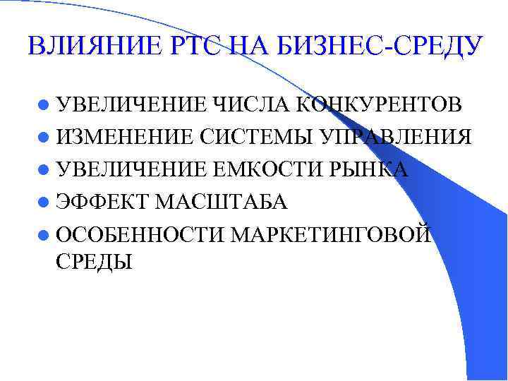 ВЛИЯНИЕ РТС НА БИЗНЕС-СРЕДУ l УВЕЛИЧЕНИЕ ЧИСЛА КОНКУРЕНТОВ l ИЗМЕНЕНИЕ СИСТЕМЫ УПРАВЛЕНИЯ l УВЕЛИЧЕНИЕ ЕМКОСТИ РЫНКА l ЭФФЕКТ МАСШТАБА l ОСОБЕННОСТИ МАРКЕТИНГОВОЙ СРЕДЫ