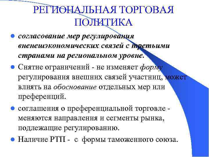 РЕГИОНАЛЬНАЯ ТОРГОВАЯ ПОЛИТИКА согласование мер регулирования вненешэкономических связей с третьими странами на региональном уровне. l Снятие ограничений - не изменяет форму регулирования внешних связей участниц, может влиять на обоснование отдельных мер или преференций. l соглашения о преференциальной торговле - меняются направления и сегменты рынка, подлежащие регулированию. l Наличие РТП - с формы таможенного союза. l