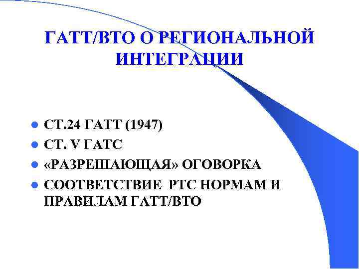 ГАТТ/ВТО О РЕГИОНАЛЬНОЙ ИНТЕГРАЦИИ СТ. 24 ГАТТ (1947) l СТ. V ГАТС l «РАЗРЕШАЮЩАЯ» ОГОВОРКА l СООТВЕТСТВИЕ РТС НОРМАМ И ПРАВИЛАМ ГАТТ/ВТО l