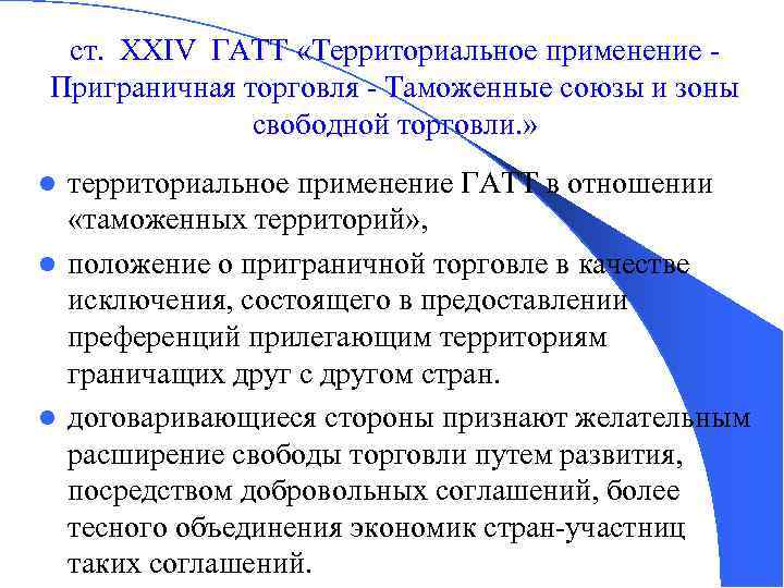 ст. XXIV ГАТТ «Территориальное применение - Приграничная торговля - Таможенные союзы и зоны свободной торговли. » территориальное применение ГАТТ в отношении «таможенных территорий» , l положение о приграничной торговле в качестве исключения, состоящего в предоставлении преференций прилегающим территориям граничащих друг с другом стран. l договаривающиеся стороны признают желательным расширение свободы торговли путем развития, посредством добровольных соглашений, более тесного объединения экономик стран-участниц таких соглашений. l