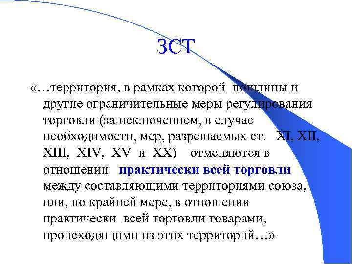 ЗСТ «…территория, в рамках которой пошлины и другие ограничительные меры регулирования торговли (за исключением, в случае необходимости, мер, разрешаемых ст. XI, XII, XIV, XV и XX) отменяются в отношении практически всей торговли между составляющими территориями союза, или, по крайней мере, в отношении практически всей торговли товарами, происходящими из этих территорий…»