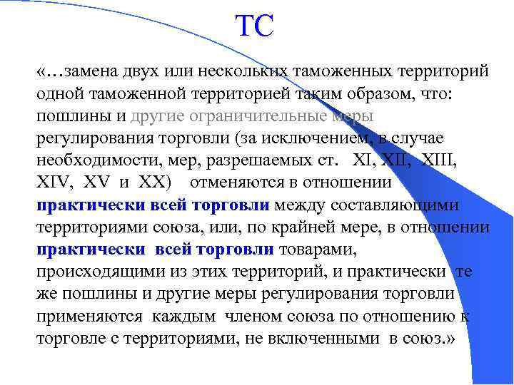 ТС «…замена двух или нескольких таможенных территорий одной таможенной территорией таким образом, что: пошлины и другие ограничительные меры регулирования торговли (за исключением, в случае необходимости, мер, разрешаемых ст. XI, XII, XIV, XV и XX) отменяются в отношении практически всей торговли между составляющими территориями союза, или, по крайней мере, в отношении практически всей торговли товарами, происходящими из этих территорий, и практически те же пошлины и другие меры регулирования торговли применяются каждым членом союза по отношению к торговле с территориями, не включенными в союз. »
