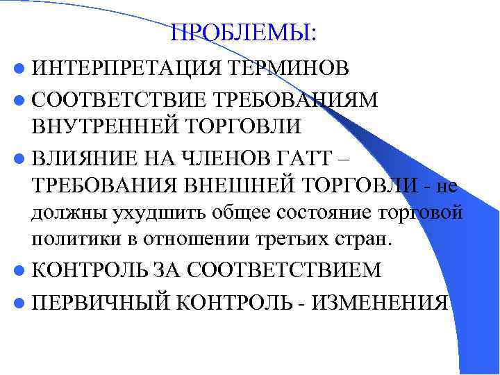 ПРОБЛЕМЫ: l ИНТЕРПРЕТАЦИЯ ТЕРМИНОВ l СООТВЕТСТВИЕ ТРЕБОВАНИЯМ ВНУТРЕННЕЙ ТОРГОВЛИ l ВЛИЯНИЕ НА ЧЛЕНОВ ГАТТ – ТРЕБОВАНИЯ ВНЕШНЕЙ ТОРГОВЛИ - не должны ухудшить общее состояние торговой политики в отношении третьих стран. l КОНТРОЛЬ ЗА СООТВЕТСТВИЕМ l ПЕРВИЧНЫЙ КОНТРОЛЬ - ИЗМЕНЕНИЯ