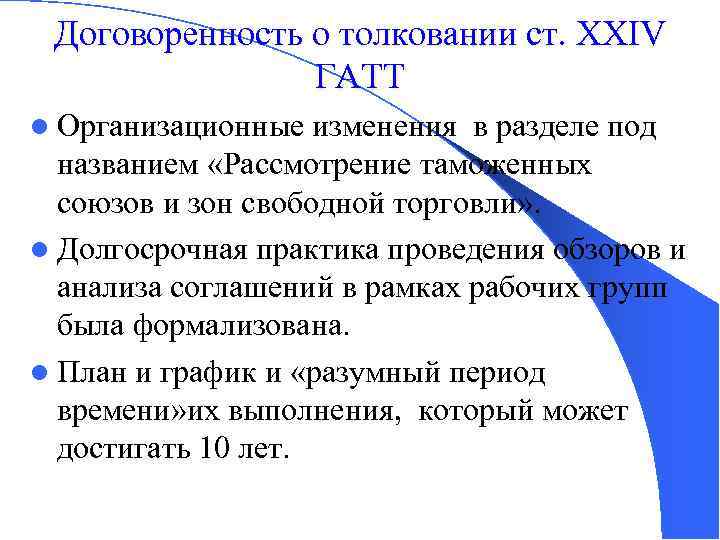 Договоренность о толковании ст. XXIV ГАТТ l Организационные изменения в разделе под названием «Рассмотрение таможенных союзов и зон свободной торговли» . l Долгосрочная практика проведения обзоров и анализа соглашений в рамках рабочих групп была формализована. l План и график и «разумный период времени» их выполнения, который может достигать 10 лет.