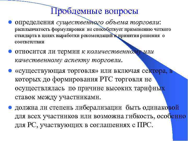 Проблемные вопросы l определения существенного объема торговли: расплывчатость формулировки не способствует применению четкого стандарта в целях выработки рекомендаций и принятия решения о соответствии относится ли термин к количественному или качественному аспекту торговли. l «существующая торговля» или включая сектора, в которых до формирования РТС торговля не осуществлялась по причине высоких тарифных ставок между участниками. l должна ли степень либерализации быть одинаковой для всех участников или возможна гибкость, особенно для РС, участвующих в соглашениях с ПРС. l