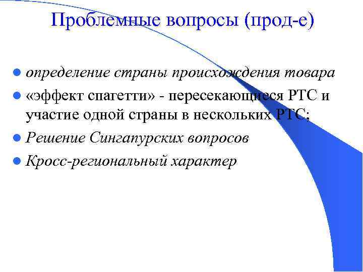 Проблемные вопросы (прод-е) l определение страны происхождения товара l «эффект спагетти» - пересекающиеся РТС и участие одной страны в нескольких РТС; l Решение Сингапурских вопросов l Кросс-региональный характер