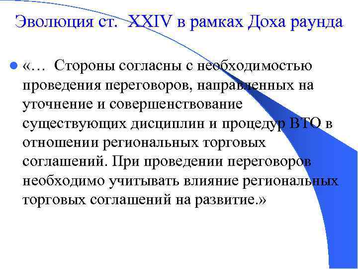 Эволюция ст. XXIV в рамках Доха раунда l «… Стороны согласны с необходимостью проведения переговоров, направленных на уточнение и совершенствование существующих дисциплин и процедур ВТО в отношении региональных торговых соглашений. При проведении переговоров необходимо учитывать влияние региональных торговых соглашений на развитие. »