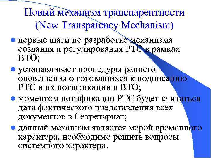 Новый механизм транспарентности (New Transparency Mechanism) l первые шаги по разработке механизма создания и регулирования РТС в рамках ВТО; l устанавливает процедуры раннего оповещения о готовящихся к подписанию РТС и их нотификации в ВТО; l моментом нотификации РТС будет считаться дата фактического представления всех документов в Секретариат; l данный механизм является мерой временного характера, необходимо решить вопросы системного характера.