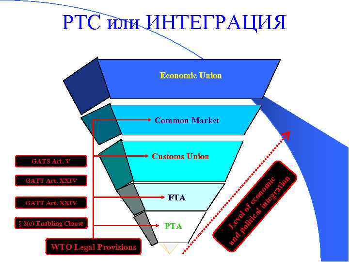 РТС или ИНТЕГРАЦИЯ Economic Union Common Market GATT Art. XXIV PTA WTO Legal Provisions an d § 2(c) Enabling Clause FTA po vel lit of ica ec l i ono nt m eg ic ra tio n Customs Union Le GATS Art. V