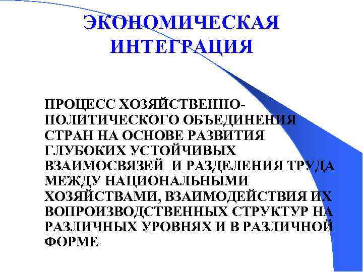 ЭКОНОМИЧЕСКАЯ ИНТЕГРАЦИЯ ПРОЦЕСС ХОЗЯЙСТВЕННОПОЛИТИЧЕСКОГО ОБЪЕДИНЕНИЯ СТРАН НА ОСНОВЕ РАЗВИТИЯ ГЛУБОКИХ УСТОЙЧИВЫХ ВЗАИМОСВЯЗЕЙ И РАЗДЕЛЕНИЯ ТРУДА МЕЖДУ НАЦИОНАЛЬНЫМИ ХОЗЯЙСТВАМИ, ВЗАИМОДЕЙСТВИЯ ИХ ВОПРОИЗВОДСТВЕННЫХ СТРУКТУР НА РАЗЛИЧНЫХ УРОВНЯХ И В РАЗЛИЧНОЙ ФОРМЕ