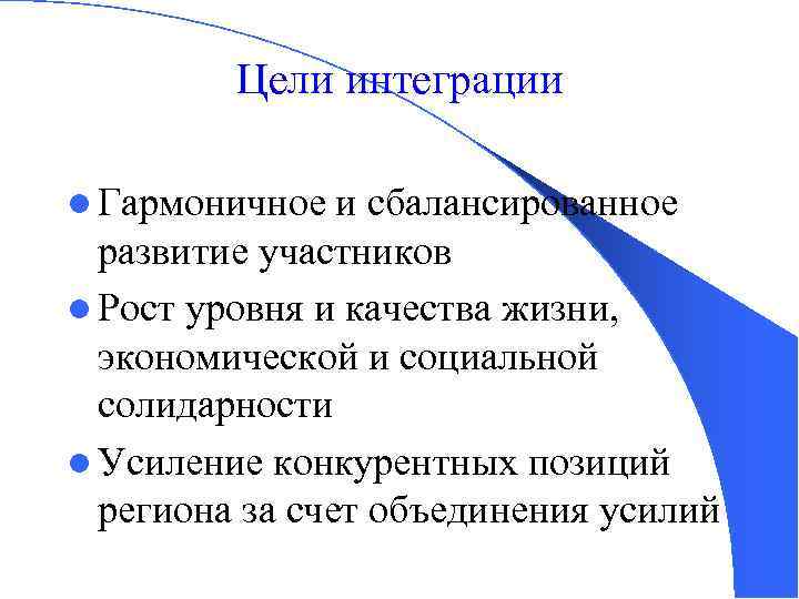 Цели интеграции l Гармоничное и сбалансированное развитие участников l Рост уровня и качества жизни, экономической и социальной солидарности l Усиление конкурентных позиций региона за счет объединения усилий