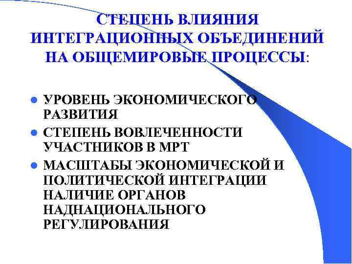 СТЕПЕНЬ ВЛИЯНИЯ ИНТЕГРАЦИОННЫХ ОБЪЕДИНЕНИЙ НА ОБЩЕМИРОВЫЕ ПРОЦЕССЫ: УРОВЕНЬ ЭКОНОМИЧЕСКОГО РАЗВИТИЯ l СТЕПЕНЬ ВОВЛЕЧЕННОСТИ УЧАСТНИКОВ В МРТ l МАСШТАБЫ ЭКОНОМИЧЕСКОЙ И ПОЛИТИЧЕСКОЙ ИНТЕГРАЦИИ НАЛИЧИЕ ОРГАНОВ НАДНАЦИОНАЛЬНОГО РЕГУЛИРОВАНИЯ l