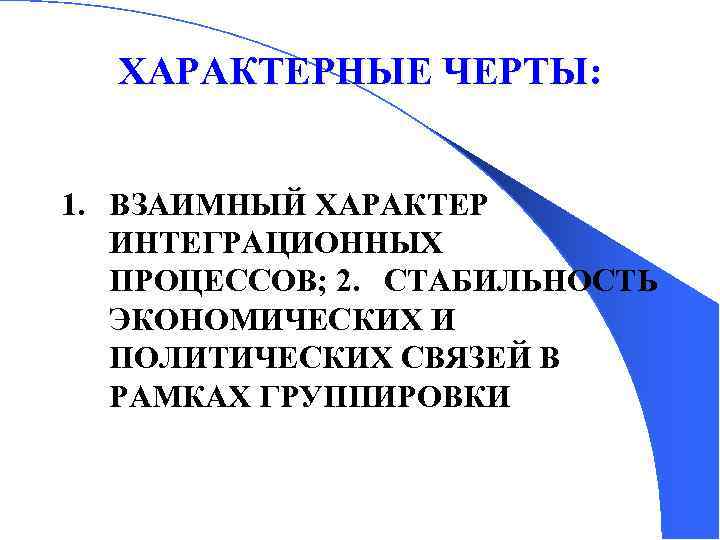 ХАРАКТЕРНЫЕ ЧЕРТЫ: 1. ВЗАИМНЫЙ ХАРАКТЕР ИНТЕГРАЦИОННЫХ ПРОЦЕССОВ; 2. СТАБИЛЬНОСТЬ ЭКОНОМИЧЕСКИХ И ПОЛИТИЧЕСКИХ СВЯЗЕЙ В РАМКАХ ГРУППИРОВКИ