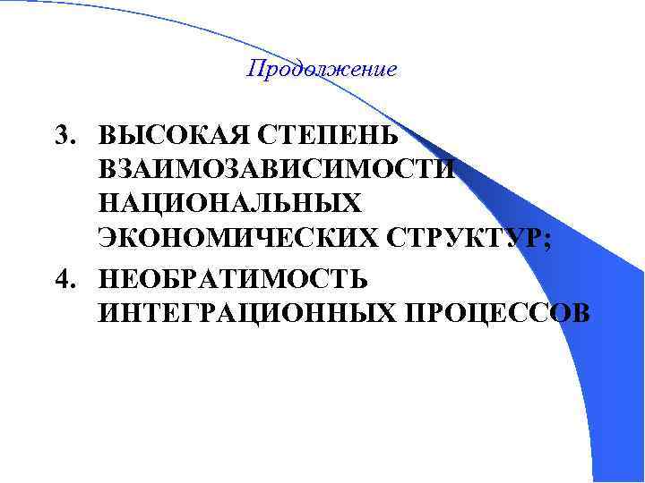 Продолжение 3. ВЫСОКАЯ СТЕПЕНЬ ВЗАИМОЗАВИСИМОСТИ НАЦИОНАЛЬНЫХ ЭКОНОМИЧЕСКИХ СТРУКТУР; 4. НЕОБРАТИМОСТЬ ИНТЕГРАЦИОННЫХ ПРОЦЕССОВ