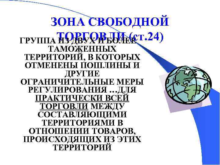 ЗОНА СВОБОДНОЙ ГРУППА ТОРГОВЛИ (ст. 24) ИЗ ДВУХ И БОЛЕЕ ТАМОЖЕННЫХ ТЕРРИТОРИЙ, В КОТОРЫХ ОТМЕНЕНЫ ПОШЛИНЫ И ДРУГИЕ ОГРАНИЧИТЕЛЬНЫЕ МЕРЫ РЕГУЛИРОВАНИЯ …ДЛЯ ПРАКТИЧЕСКИ ВСЕЙ ТОРГОВЛИ МЕЖДУ СОСТАВЛЯЮЩИМИ ТЕРРИТОРИЯМИ В ОТНОШЕНИИ ТОВАРОВ, ПРОИСХОДЯЩИХ ИЗ ЭТИХ ТЕРРИТОРИЙ