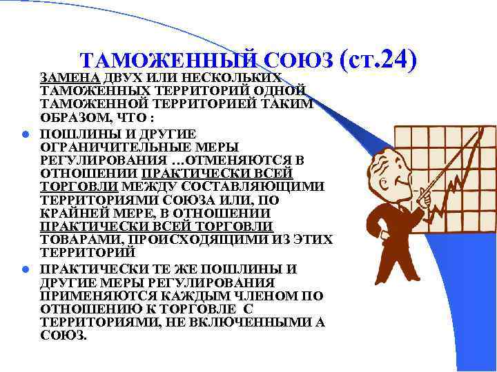 ТАМОЖЕННЫЙ СОЮЗ (ст. 24) ЗАМЕНА ДВУХ ИЛИ НЕСКОЛЬКИХ ТАМОЖЕННЫХ ТЕРРИТОРИЙ ОДНОЙ ТАМОЖЕННОЙ ТЕРРИТОРИЕЙ ТАКИМ ОБРАЗОМ, ЧТО : l ПОШЛИНЫ И ДРУГИЕ ОГРАНИЧИТЕЛЬНЫЕ МЕРЫ РЕГУЛИРОВАНИЯ …ОТМЕНЯЮТСЯ В ОТНОШЕНИИ ПРАКТИЧЕСКИ ВСЕЙ ТОРГОВЛИ МЕЖДУ СОСТАВЛЯЮЩИМИ ТЕРРИТОРИЯМИ СОЮЗА ИЛИ, ПО КРАЙНЕЙ МЕРЕ, В ОТНОШЕНИИ ПРАКТИЧЕСКИ ВСЕЙ ТОРГОВЛИ ТОВАРАМИ, ПРОИСХОДЯЩИМИ ИЗ ЭТИХ ТЕРРИТОРИЙ l ПРАКТИЧЕСКИ ТЕ ЖЕ ПОШЛИНЫ И ДРУГИЕ МЕРЫ РЕГУЛИРОВАНИЯ ПРИМЕНЯЮТСЯ КАЖДЫМ ЧЛЕНОМ ПО ОТНОШЕНИЮ К ТОРГОВЛЕ С ТЕРРИТОРИЯМИ, НЕ ВКЛЮЧЕННЫМИ А СОЮЗ.