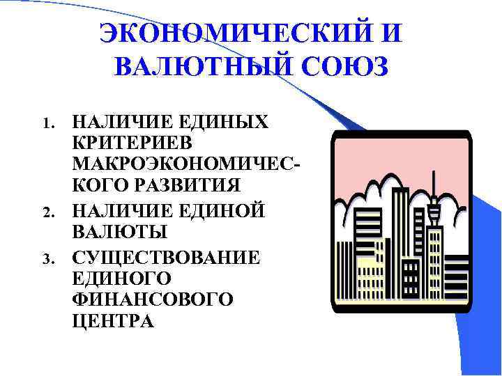 ЭКОНОМИЧЕСКИЙ И ВАЛЮТНЫЙ СОЮЗ НАЛИЧИЕ ЕДИНЫХ КРИТЕРИЕВ МАКРОЭКОНОМИЧЕСКОГО РАЗВИТИЯ 2. НАЛИЧИЕ ЕДИНОЙ ВАЛЮТЫ 3. СУЩЕСТВОВАНИЕ ЕДИНОГО ФИНАНСОВОГО ЦЕНТРА 1.