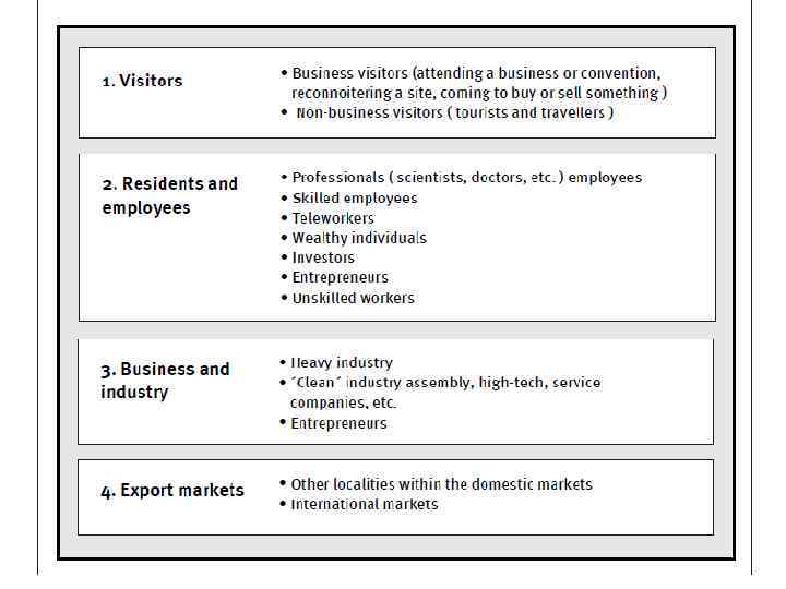 Kotler: Target Markets of PM/Place Customers • producers of goods and services, • corporate headquarters and regional offices • outside investment and export markets • tourism and hospitality • new residents