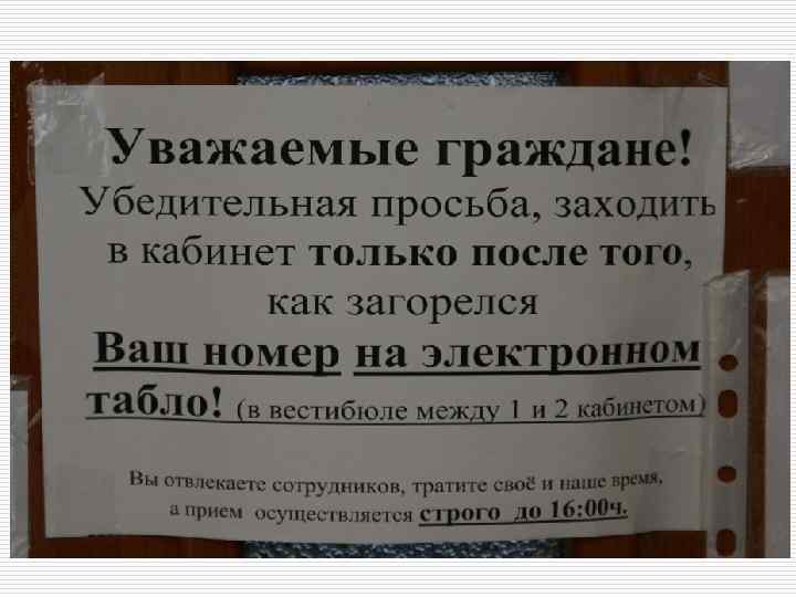 Устойчивые представления получателей услуг. В отношении ожидания и организации очередности приема o очередность должна организовываться и контролироваться органом, оказывающим услугу, например посредством бирок, вызова и пр. способами; o ожидание должно проходить в помещении (холле), а не в коридоре; o должно быть достаточно мест для сидения; o при ожидании более 10 -15 минут должны быть туалет и гардероб для посетителей. o ожидание не должно превышать 30 минут; o обеспечение нескучного ожидания (журналы, стенды, музыка, радио, ТВ), в том числе предоставление полезной информации в интересном изложении.