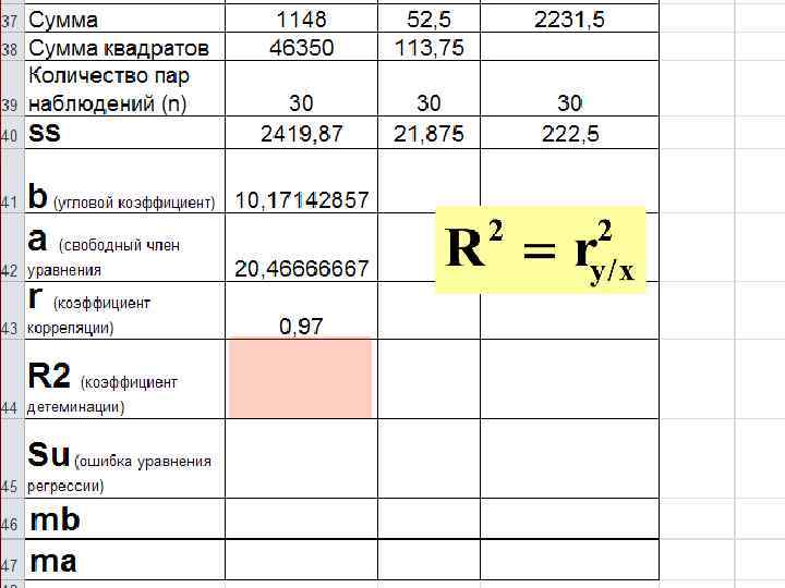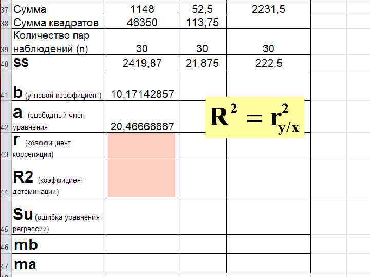 Расчет параметров уравнения регрессии где - предсказанное (теоретическое) значение Y для данного X. a и b - выборочные значения параметров регрессионной модели, их находят с использованием процедуры метода. наименьших квадратов Суть МНК заключается в минимизации сумм квадратов отклонений наблюдаемых значений зависимой переменной от их теоретических величин, принадлежащих линии регрессии. Т. е. a и b подбираются таким образом, чтобы при их подстановке в уравнение получалось минимальное значение E - суммы квадратов отклонения от линии регрессии.