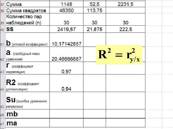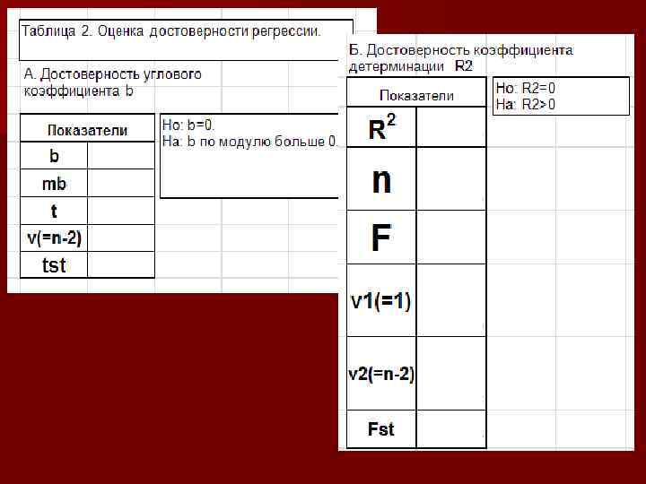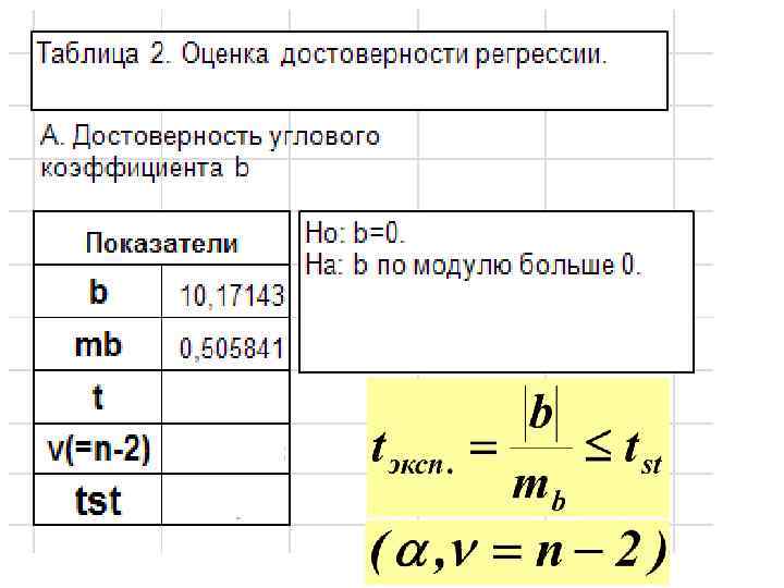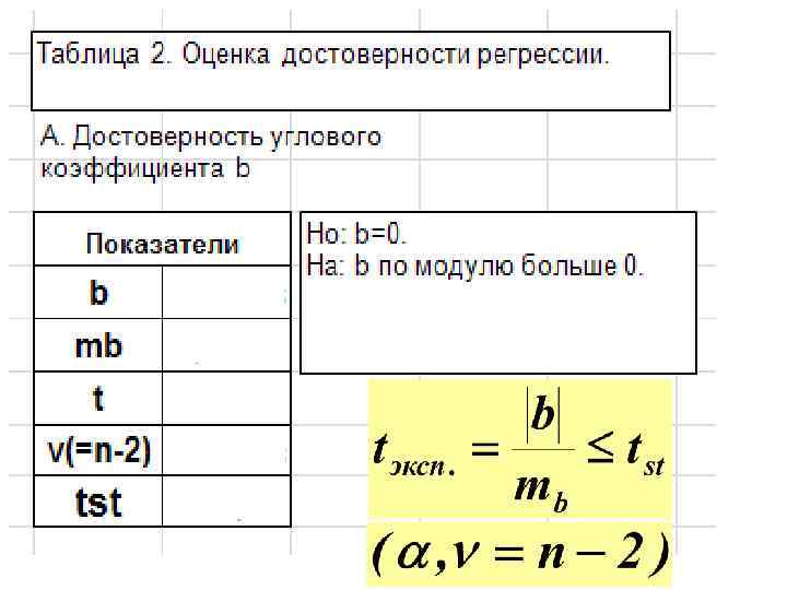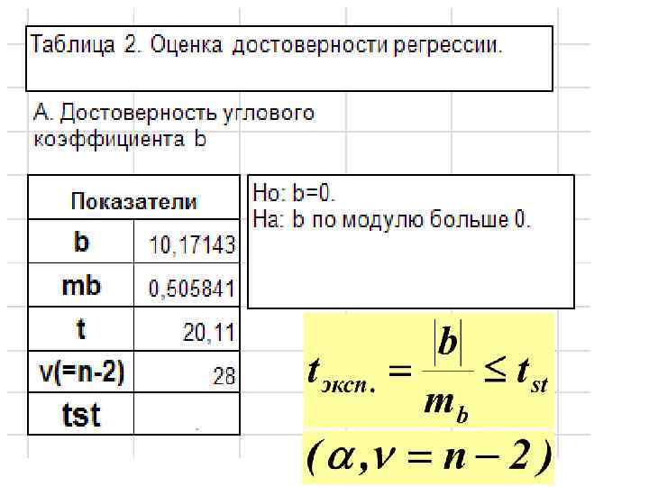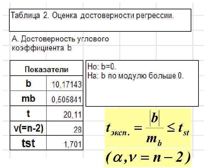 2. Достоверность наклона линии регрессии НО: В генеральной совокупности нет изменений значений функции по оси аргумента. Следовательно, наблюдаемое отличие углового коэффициента (b) от нуля случайно. H 1: угловой коэффициент по модулю больше 0. Нулевая гипотеза сохраняется, если соблюдается равенство: