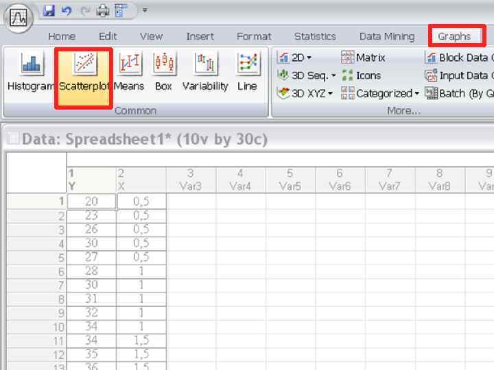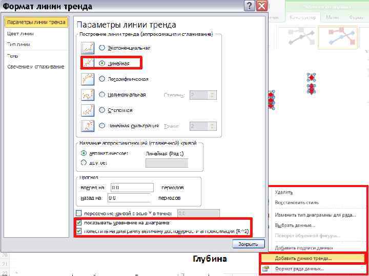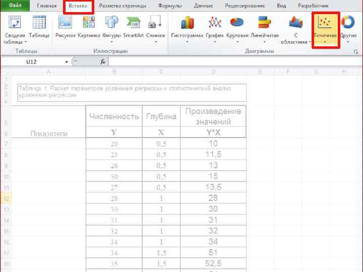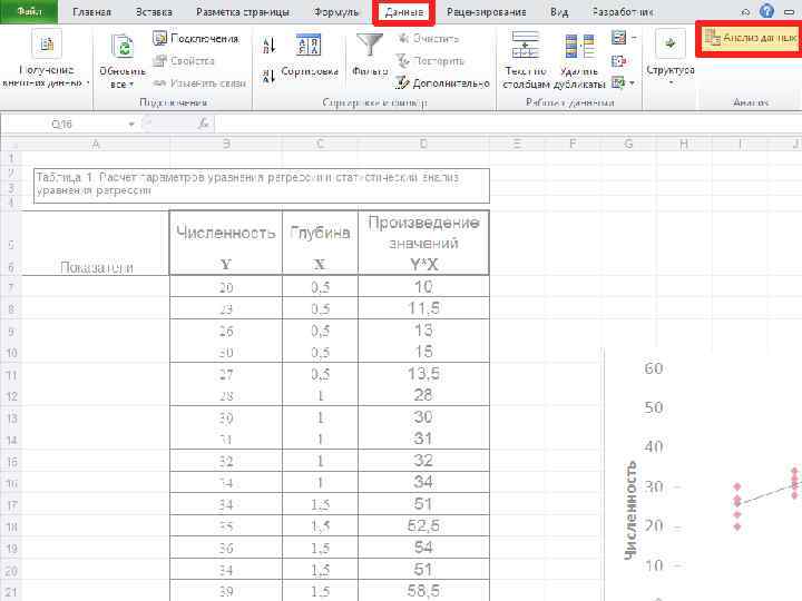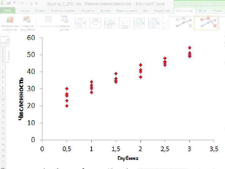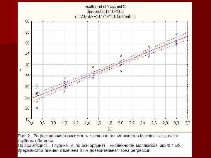 Пример. Изучаем влияние глубины на величину численности моллюсков Macoma calcarea. Для этого на 6 станциях на глубинах от 0. 5 до 3 м взято по 5 выборочных площадок площадью 0. 1 м 2, в каждой из которых посчитали количество моллюсков. показа тели 0. 5 1 1. 5 2 2. 5 3 yi 20 28 34 37 44 50 23 30 35 40 45 50 26 31 36 41 46 51 30 32 34 44 46 54 27 34 39 44 48 49 M Глубина, м 25, 2 31 35, 6 41, 2 45, 8 50, 8 Зависимая переменная (Y) – численность моллюсков, экз. /м 2; Независимая переменная (X)глубина, м. Зависимость численности моллюсков Macoma calcarea от глубины обитания. По оси абсцисс - Глубина, м; по оси ординат - Численность моллюсков, экз. /0, 1 м 2