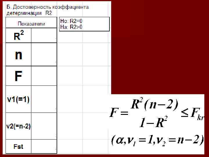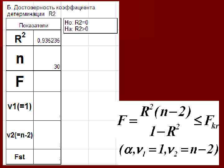 3. Достоверность коэффициента детерминации НО: В генеральной совокупности регрессионной связи нет и наблюдаемое отличие коэффициента детерминации от нуля случайно. Н 1: коэффициент детерминации больше нуля. Нулевая гипотеза отвергается, если: При соблюдении этого условия коэффициент детерминации с вероятностью отличается от нуля