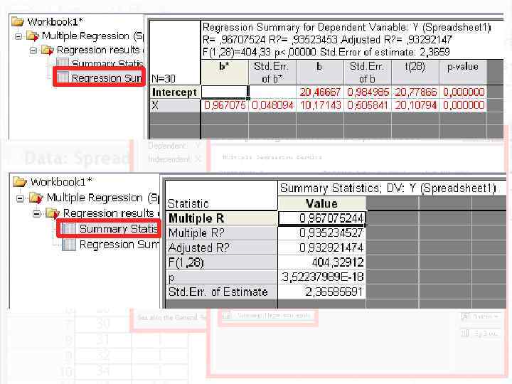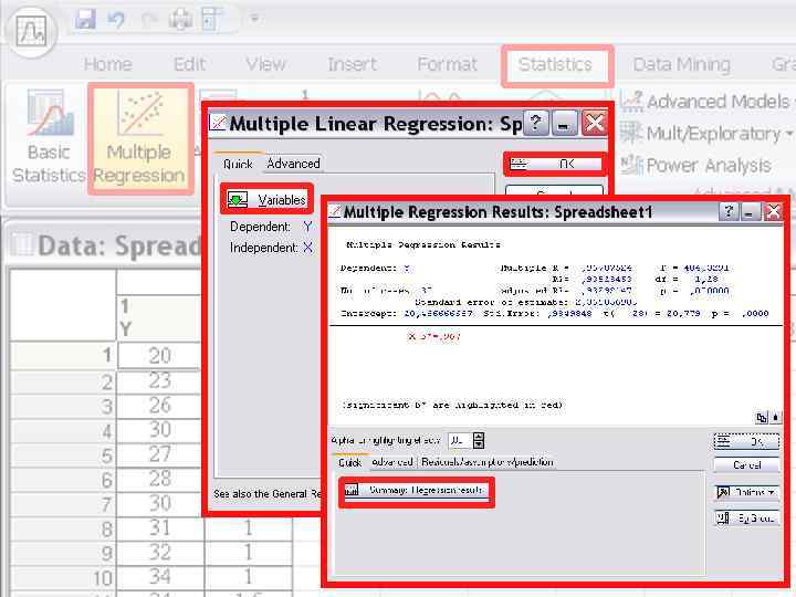 Линейная регрессия Модель – уравнение прямой – Y = a + b*X Построение модели – расчет коэффициентов признак Y - эмпирические значения признака Y - теоретические значения признака Y МНК –метод наименьших квадратов Прямая должна пройти так, чтобы сумма квадратов отклонений эмпирических значений Y от теоретических была минимальна. Прямая пройдет через точку (Xср, Yср) признак X