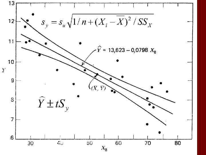 Доверительная зона регрессии 95% доверительный интервал линии регрессии строится в соответствии с выражением t - критерий Стьюдента, =n-2, Следует сделать несколько расчетов для отдельных значений