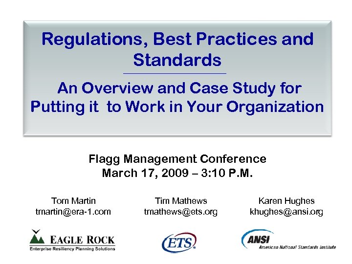 Regulations, Best Practices and Standards An Overview and Case Study for Putting it to Work in Your Organization Flagg Management Conference March 17, 2009 – 3: 10 P. M. Tom Martin tmartin@era-1. com Tim Mathews tmathews@ets. org Karen Hughes khughes@ansi. org