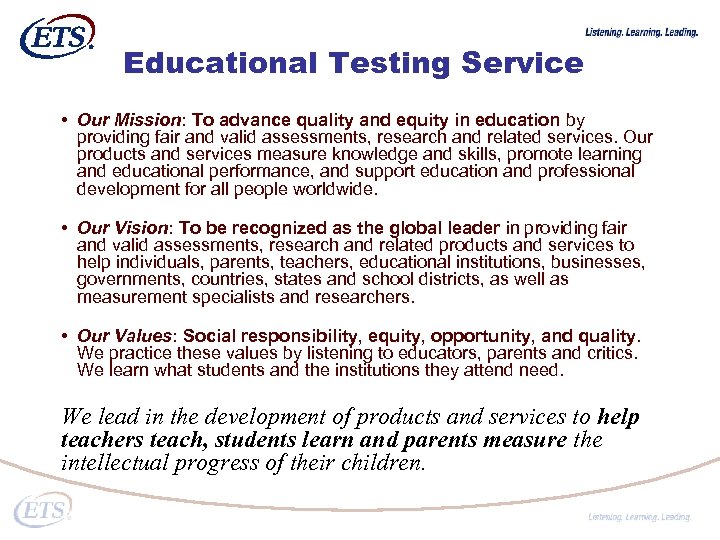Educational Testing Service • Our Mission: To advance quality and equity in education by providing fair and valid assessments, research and related services. Our products and services measure knowledge and skills, promote learning and educational performance, and support education and professional development for all people worldwide. • Our Vision: To be recognized as the global leader in providing fair and valid assessments, research and related products and services to help individuals, parents, teachers, educational institutions, businesses, governments, countries, states and school districts, as well as measurement specialists and researchers. • Our Values: Social responsibility, equity, opportunity, and quality. We practice these values by listening to educators, parents and critics. We learn what students and the institutions they attend need. We lead in the development of products and services to help teachers teach, students learn and parents measure the intellectual progress of their children.