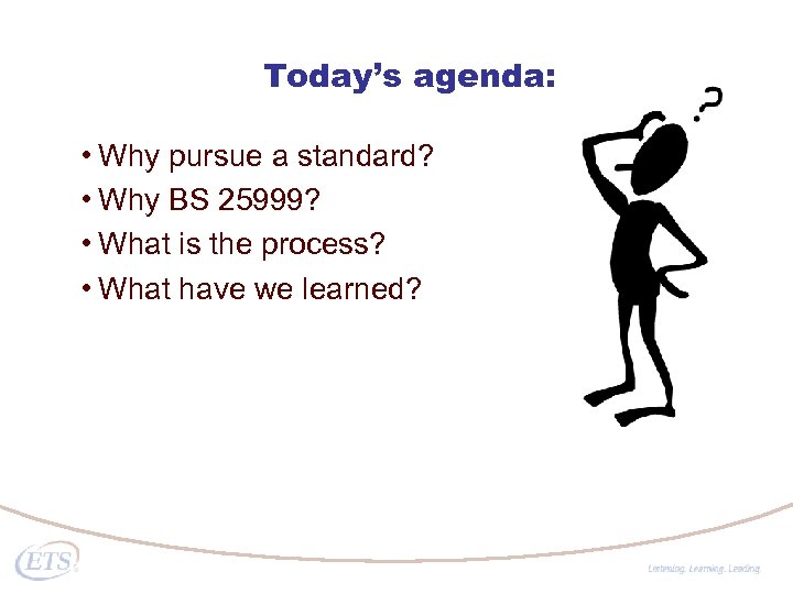 Today’s agenda: • Why pursue a standard? • Why BS 25999? • What is the process? • What have we learned?