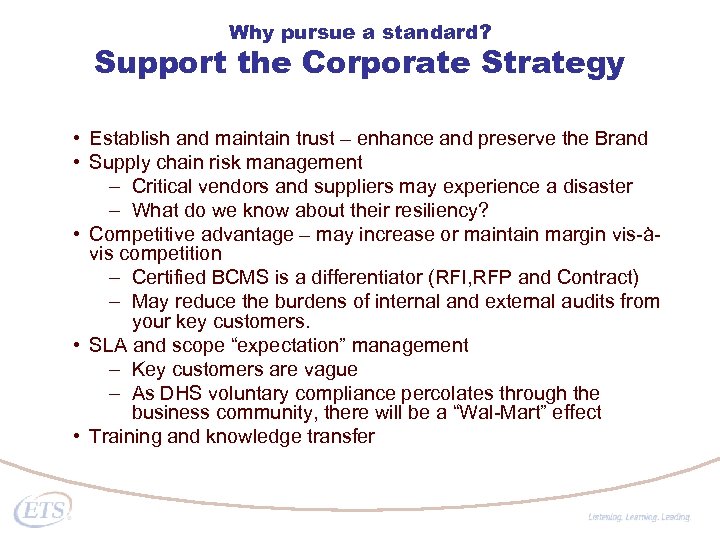 Why pursue a standard? Support the Corporate Strategy • Establish and maintain trust – enhance and preserve the Brand • Supply chain risk management – Critical vendors and suppliers may experience a disaster – What do we know about their resiliency? • Competitive advantage – may increase or maintain margin vis-à- vis competition – Certified BCMS is a differentiator (RFI, RFP and Contract) – May reduce the burdens of internal and external audits from your key customers. • SLA and scope “expectation” management – Key customers are vague – As DHS voluntary compliance percolates through the business community, there will be a “Wal-Mart” effect • Training and knowledge transfer