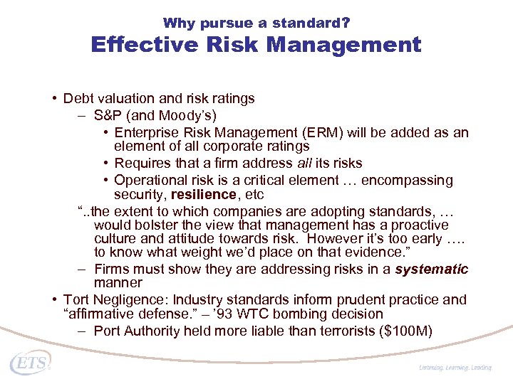 Why pursue a standard? Effective Risk Management • Debt valuation and risk ratings – S&P (and Moody’s) • Enterprise Risk Management (ERM) will be added as an element of all corporate ratings • Requires that a firm address all its risks • Operational risk is a critical element … encompassing security, resilience, etc “. . the extent to which companies are adopting standards, … would bolster the view that management has a proactive culture and attitude towards risk. However it’s too early …. to know what weight we’d place on that evidence. ” – Firms must show they are addressing risks in a systematic manner • Tort Negligence: Industry standards inform prudent practice and “affirmative defense. ” – ’ 93 WTC bombing decision – Port Authority held more liable than terrorists ($100 M)
