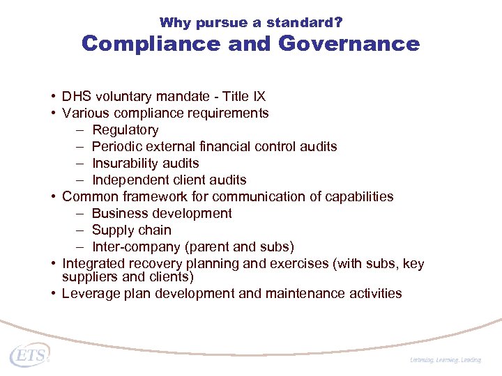 Why pursue a standard? Compliance and Governance • DHS voluntary mandate - Title IX • Various compliance requirements – Regulatory – Periodic external financial control audits – Insurability audits – Independent client audits • Common framework for communication of capabilities – Business development – Supply chain – Inter-company (parent and subs) • Integrated recovery planning and exercises (with subs, key suppliers and clients) • Leverage plan development and maintenance activities