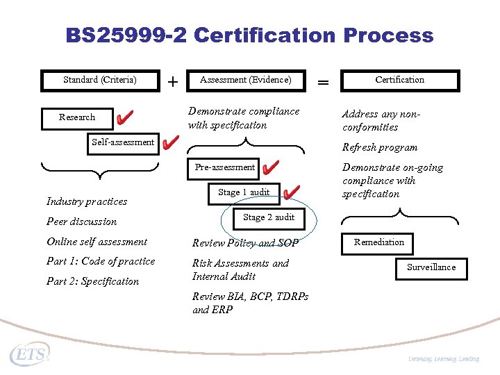 BS 25999 -2 Certification Process Standard (Criteria) Research + Assessment (Evidence) Demonstrate compliance with specification Self-assessment Peer discussion Stage 1 audit Address any nonconformities Demonstrate on-going compliance with specification Stage 2 audit Online self assessment Review Policy and SOP Part 1: Code of practice Risk Assessments and Internal Audit Part 2: Specification Certification Refresh program Pre-assessment Industry practices = Review BIA, BCP, TDRPs and ERP Remediation Surveillance