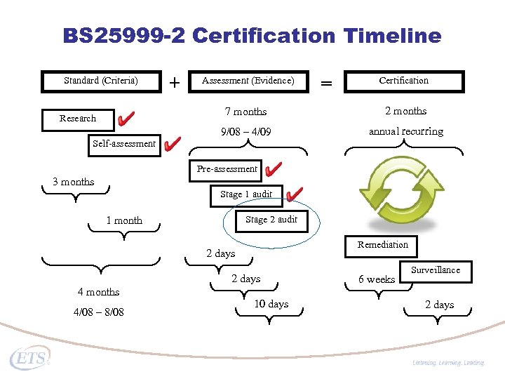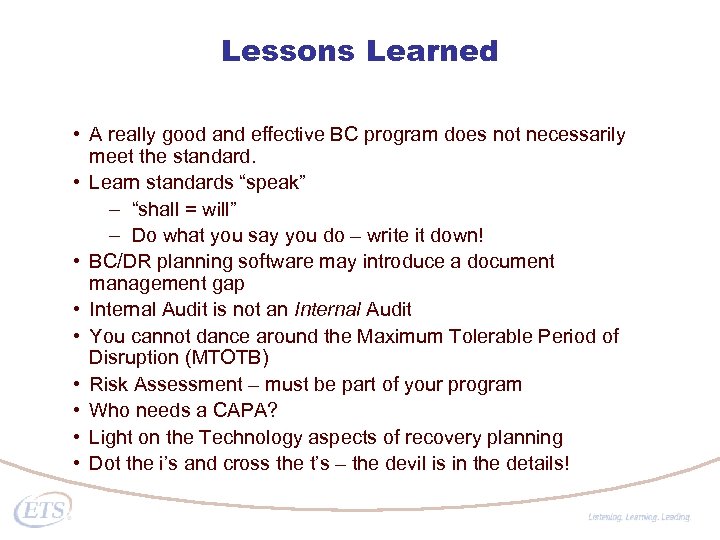 Why BS 25999? • Accepted Standard that establishes the process, principles and • • • terminology of business continuity management (BCM) BS 25999 -1 Code of Practice – provides guidance and recommendations BS 25999 -2 Detailed Specification – appears to meet or exceed the published DHS criteria Provides a non-prescriptive, generic model to follow in creating and maintaining preparedness processes and activities ETS Enterprise Resiliency program aligned well to the standard Gaps were straight forward to implement
